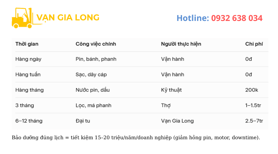 Dựa trên hơn 3.000 xe nâng điện đã bảo dưỡng tại Vạn Gia Long (từ 1.5 tấn đến 5 tấn, các hãng Hangcha, Heli, Toyota, Nichiyu), chúng tôi xây dựng lịch 5 cấp – thực tế, dễ áp dụng, chi phí tối ưu. Áp dụng đúng → pin bền 6–8 năm, motor ít hỏng, downtime < 1 ngày/năm.