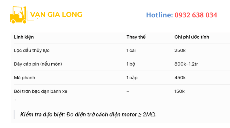 Hi vọng với những chia sẻ chi tiết, thực tế bên trên của Sửa Xe Nâng Vạn Gia Long sẽ giúp bạn xây dựng lịch bảo dưỡng chuẩn kỹ thuật, giữ xe nâng điện luôn “khỏe mạnh”, tối ưu chi phí vận hành và kéo dài tuổi thọ pin – motor lên đến 8 năm.