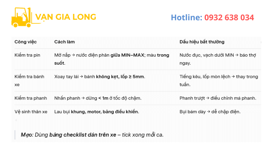 Nếu cần lập kế hoạch bảo dưỡng riêng cho kho, kiểm tra pin miễn phí hay đặt lịch đại tu tận nơi, hãy liên hệ ngay: